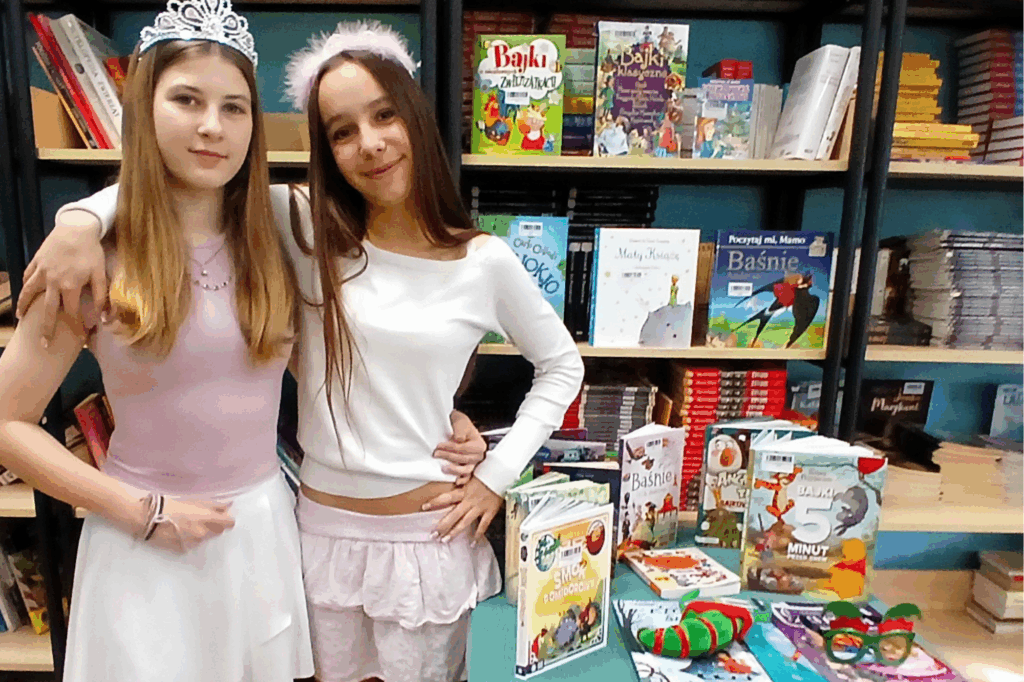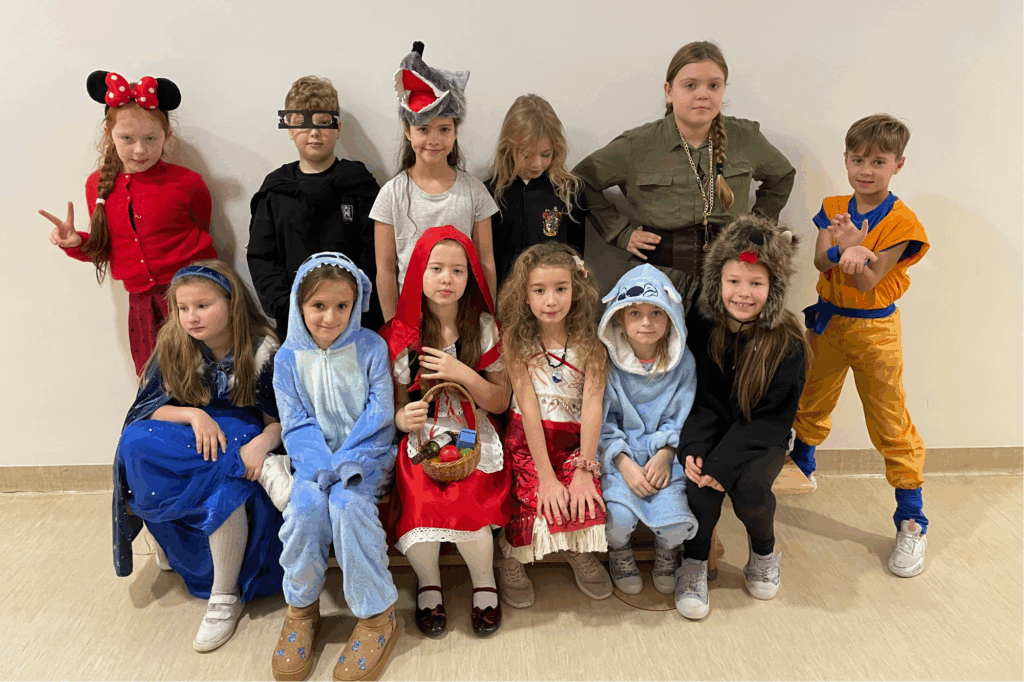 Z tej okazji uczniowie i nauczyciele wcielili się w ukochanych bohaterów znanych opowieści. Po szkolnych korytarzach spacerowała Myszka Miki, królowa w koronie, Doktor Dolittle, roześmiane księżniczki, Czerwony Kapturek z wilkiem pod rękę, Shrek i wróżki, Harry Potter, odważny strażak, Kot w butach, syrena i cała gromada potworów. Wszyscy razem przeszliśmy w bajkowym pochodzie, który wypełnił szkołę kolorami, muzyką i śmiechem. W szkolnej Bibliotece czekała na uczniów fotobudka przy wystawie książek, gdzie każdy mógł uwiecznić swoją bajkową przemianę. Nie zabrakło również wspólnego czytania bajek – zarówno w klasach jak i w Bibliotece. Uczniowie, którzy włączyli się do zabawy i przygotowali swoje kostiumy, zostali poczęstowani cukierkami i lizakami ufundowanymi przez Radę Rodziców.