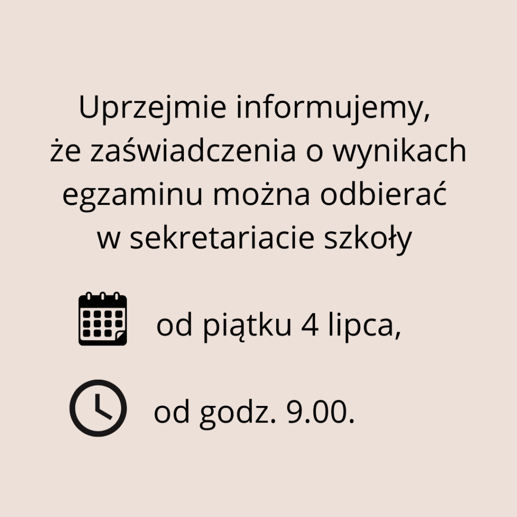 Uprzejmie informujemy, że zaświadczenia o wynikach egzaminu można odbierać w sekretariacie szkoły od piątku 4 lipca od godz. 9.00.