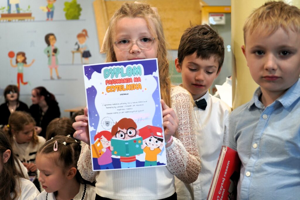 Na pamiątkę tego wydarzenia dzieci otrzymały upominki – książkę „Wnuczka antykwariusza”, Dyplomy, pierwsze imienne karty biblioteczne oraz zakładki.