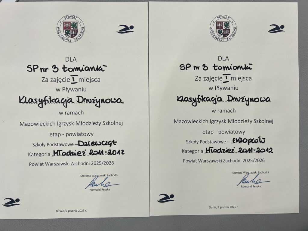 W dniu 9 grudnia 2025 roku odbyły się Powiatowe Finały w Pływaniu rozgrywane w Błoniu, pływacy naszej szkoły nie dali żadnych szans rywalom zarówno w kategorii dzieci jak i młodzieży i pewnie awansowali do kolejnego etapu, zdobywając łącznie ponad czterdzieści medali. Statuetki dla najlepszych zawodników zdobył uczeń klasy 6b – Fedirko Svitoslav w kategorii Dzieci oraz Kołnierzak Gabriela i Dłutowski Ignacy z 8b w kategorii Młodzież.