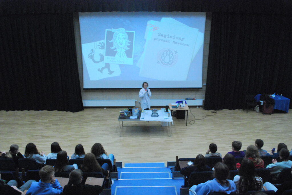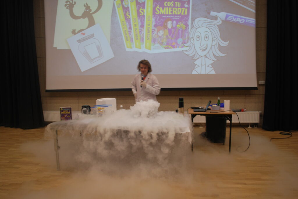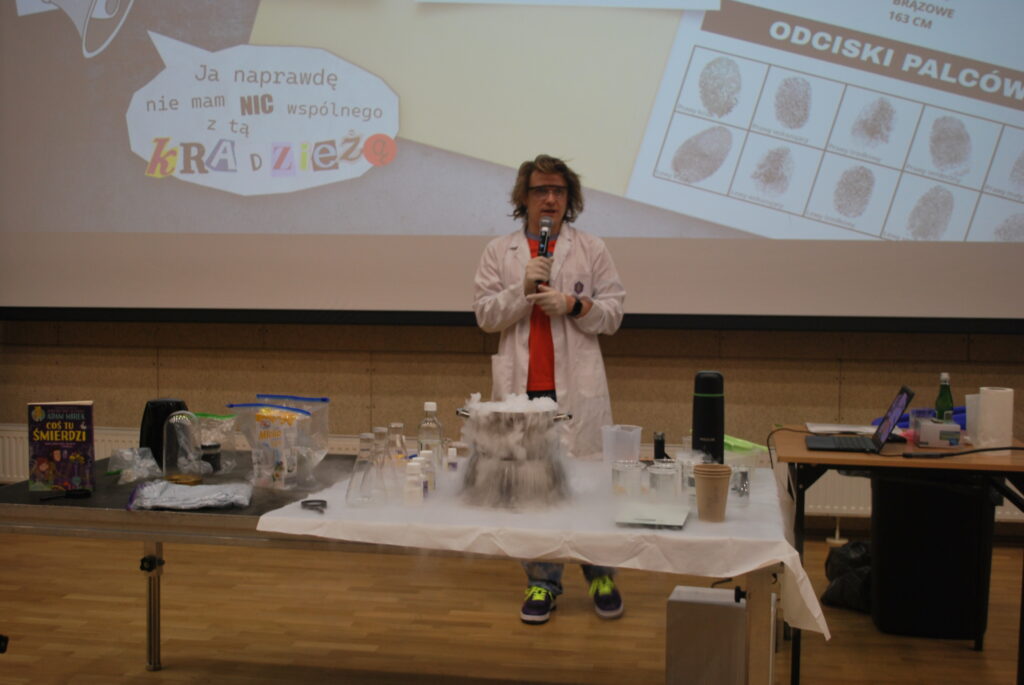We wtorek 10 lutego odbyło się w naszej szkole spotkanie z Panem Adamem Mirkiem. Pan Mirek jest doktorem inżynierii biomedycznej, autorem bestsellerowych książek dla dzieci (Glutologia, Bebebchy, Coś tu śmierdzi). Zajęcia dotyczyły popularyzacji nauki na wesoło, zwłaszcza w dziedzinie chemii. Nie zabrakło widowiskowych doświadczeń, ciekawostek oraz została rozwiązana zagadka kryminalna. Spotkanie pokazało, że nauka może być ciekawa i pokazana w bardzo atrakcyjny sposób.
