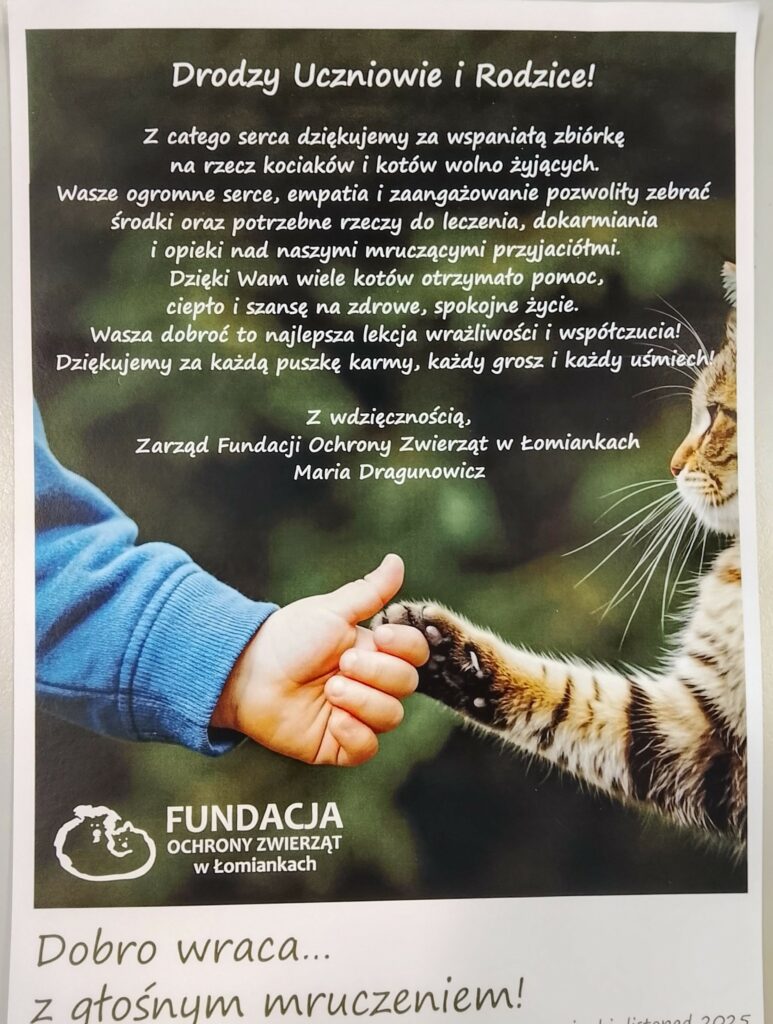 Składamy gorące podziękowania wszystkim uczniom, rodzicom, dziadkom, nauczycielom oraz pracownikom szkoły, którzy wsparli zbiórkę i okazali wielkie serce podopiecznym Fundacji.