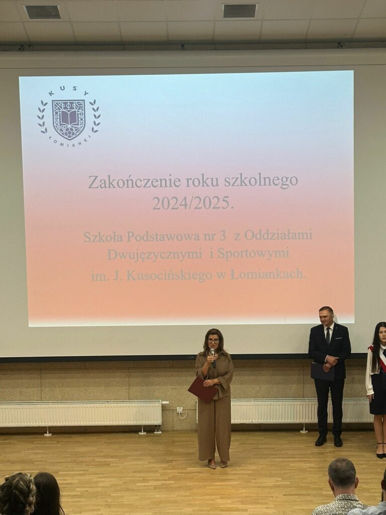 Dnia 27 czerwca 2025 r. w auli ICDS odbyło się uroczyste zakończenie roku szkolnego 2024/ 2025 r. Swoją obecnością zaszczycili nas Pani Naczelnik Wydziału Edukacji, Anna Grabowska, a także Pan płk Krzysztof Terczyński, Prezes Związku Kombatantów RP i Byłych Więźniów Politycznych Koła w Łomiankach.